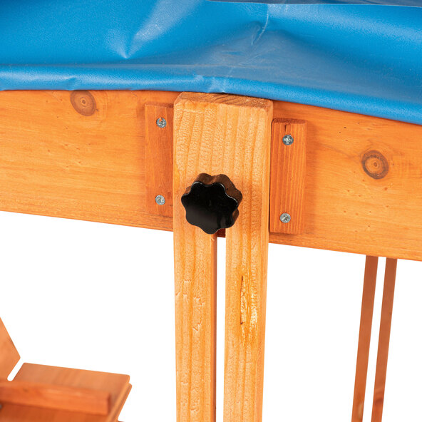Die wetterfeste Sitzbank aus Spießtanne hält wildes Spielen aus. Das Dach aus beschichtetem und wasserabweisendem Kunststoff schützt die Kinder im Sandkasten vor Sonne, Wind und Regen. Eine Abdeckung von unten hält die Nässe am Boden zurück. Dadurch bekommen die kleinen Seefahrer keine nassen Füße im Sand. So macht der Sommer Spaß!